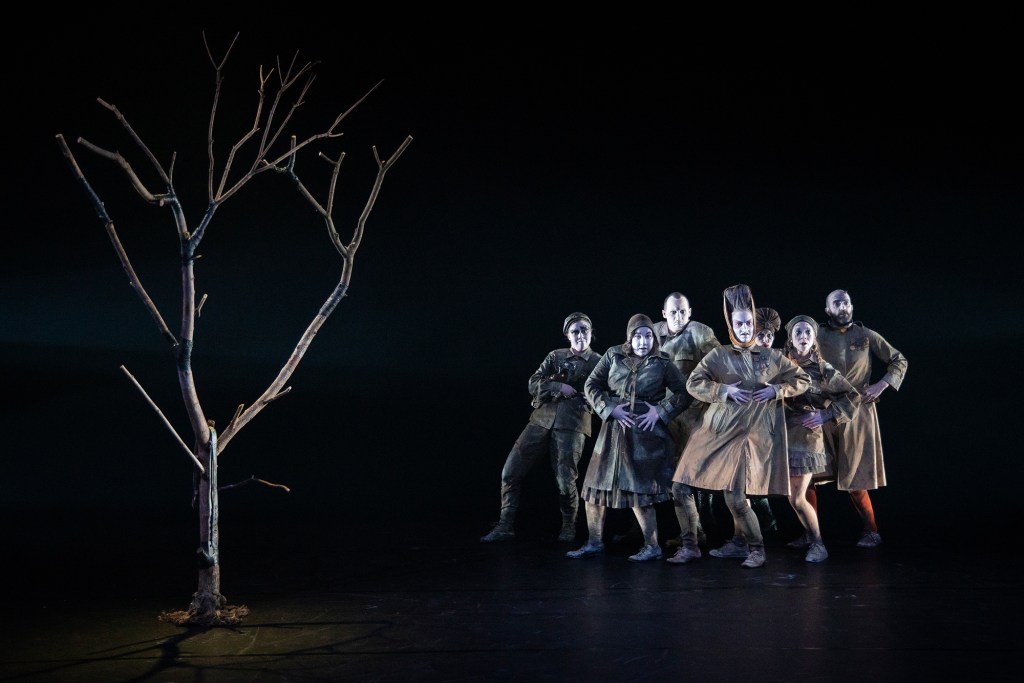 VÄLÄHDYS MIELEN JOUTOMAASTA – MAISEMASTA JONNE VARASTOIMME PITKÄT VARJOMME. Yhteisö sinnittelee tukalissa olosuhteissa ei-kenenkään-maalla, sokeina tekojensa seurauksille. Elämän ja kuoleman rajamailla he kiroavat luonnon voimia ja kurottavat kohti armoa ja vapautta. Ajastamme nouseva, tyyliltään ajaton esitys käsittelee kipeitä kollektiivisia aiheita tragikoomisin sävyin.